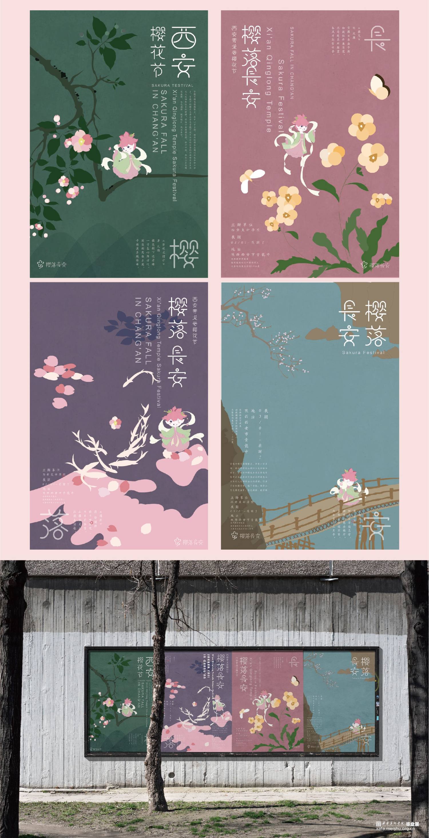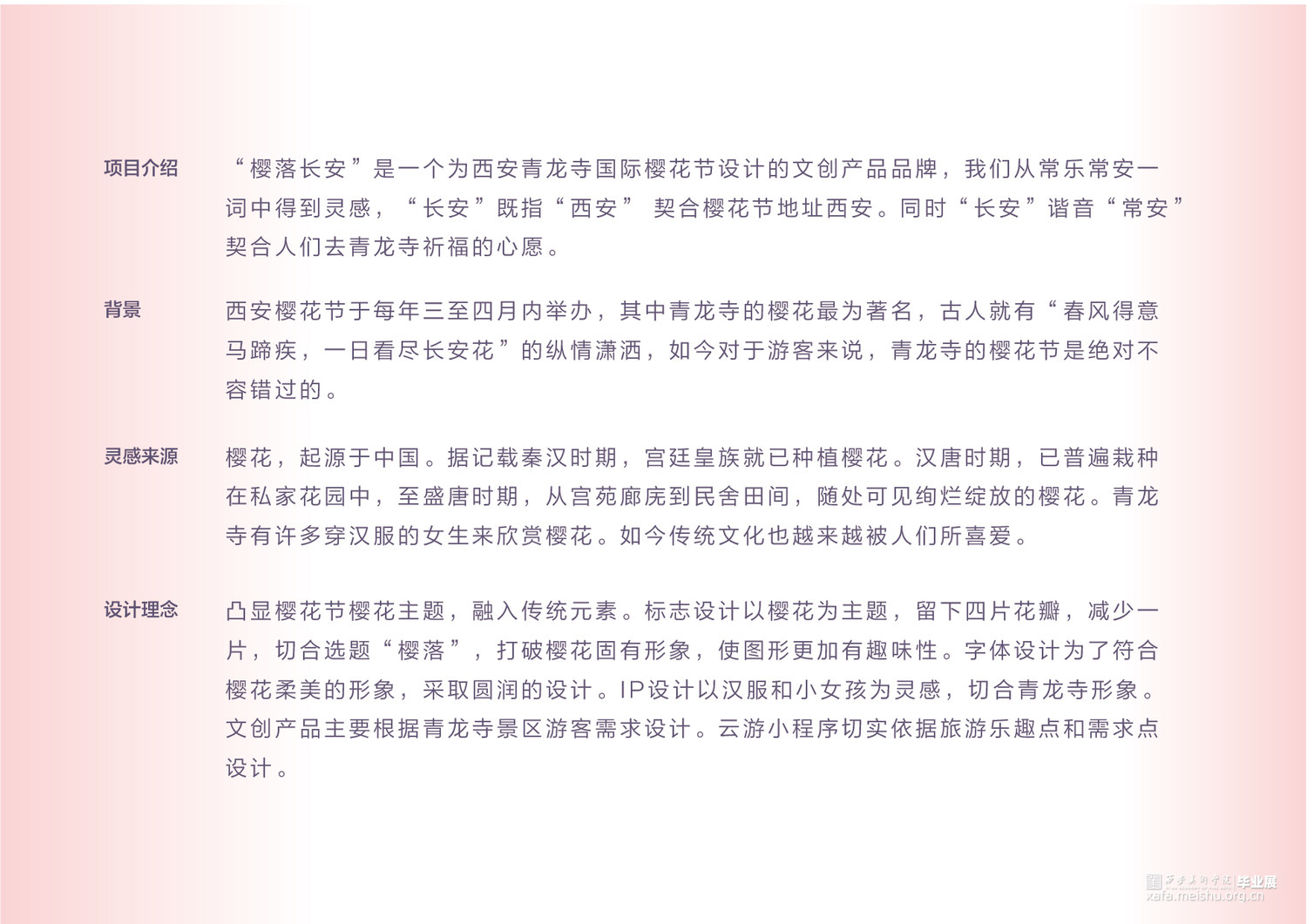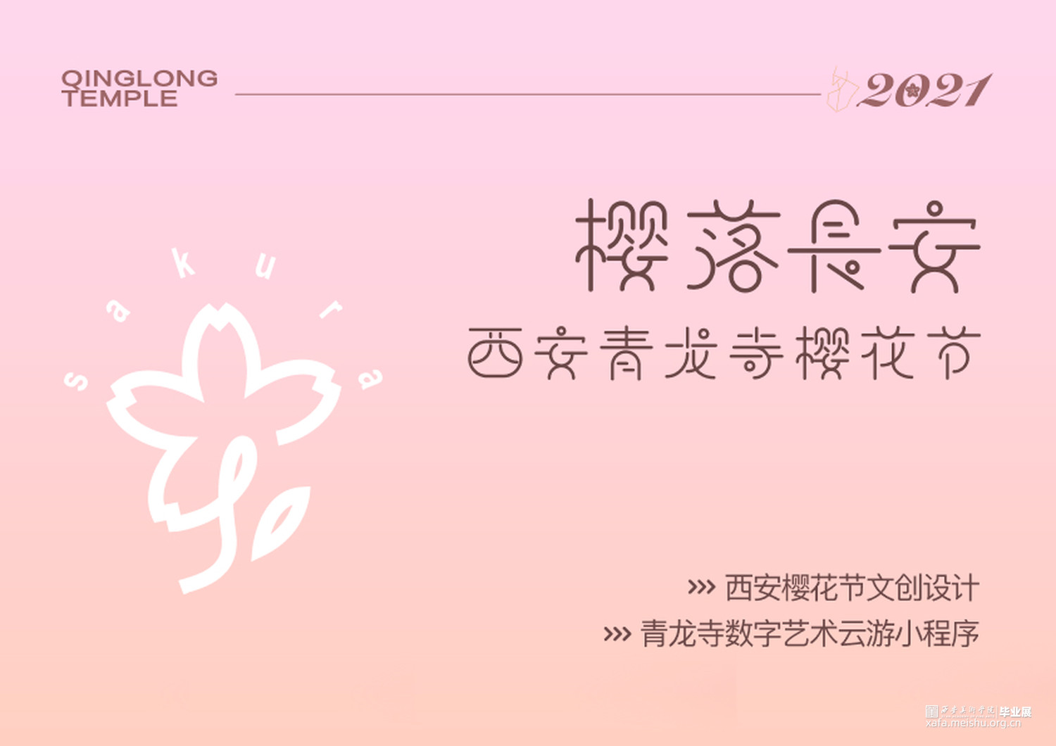本次毕设凸显樱花节樱花主题,融入传统元素。标志设计以樱花为主题,留下四片花瓣,减少一片,切合选题“樱落”,打破樱花固有形象,使图形更加有趣味性。字体设计为了符合樱花柔美的形象,采取圆润的设计。IP设计以汉服和小女孩为灵感,切合青龙寺形象。文创产品主要根据青龙寺景区游客需求设计。