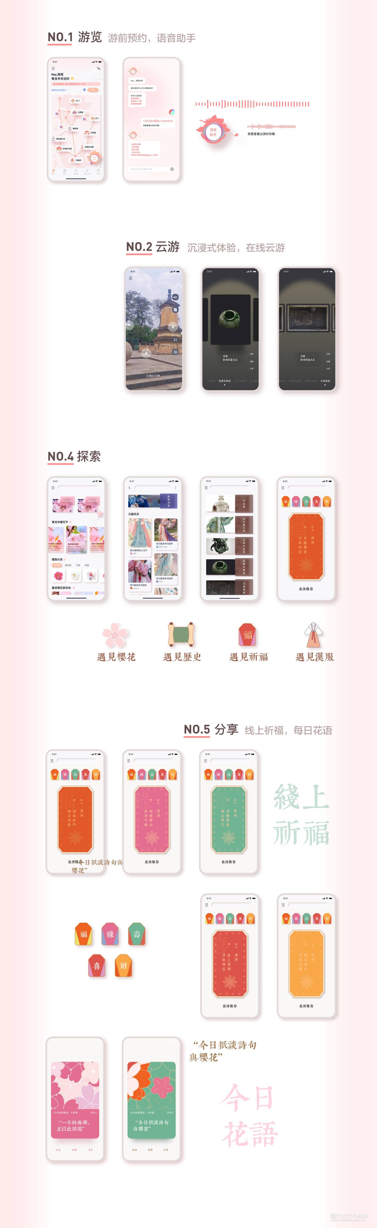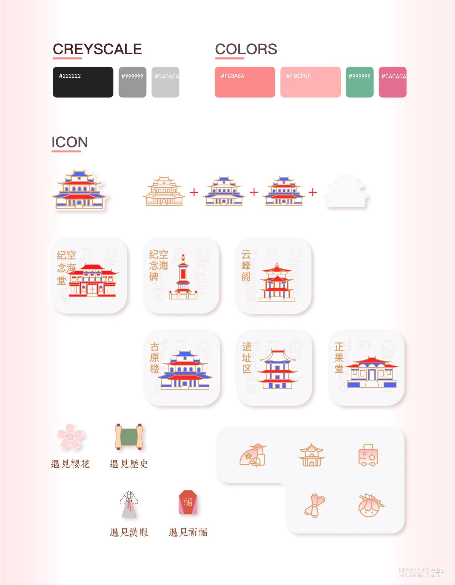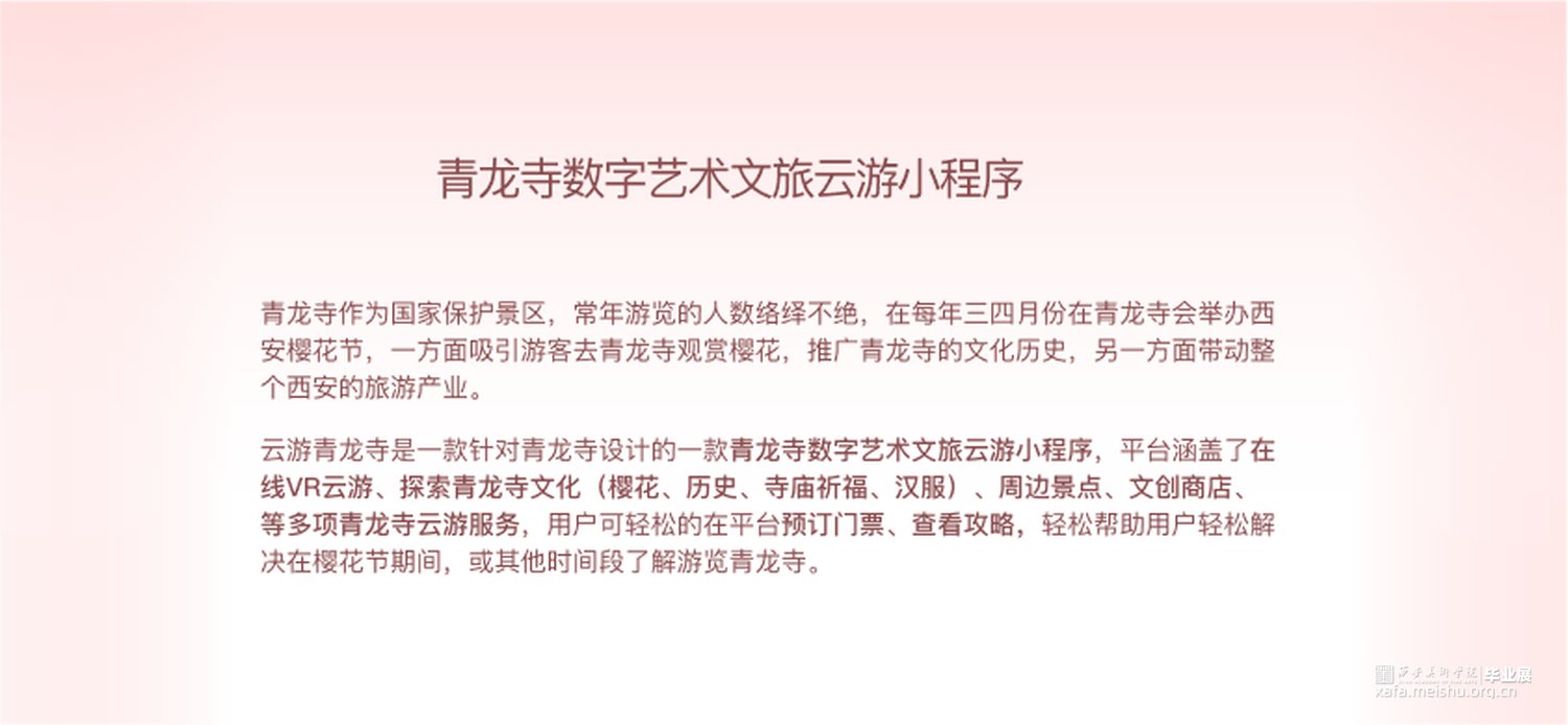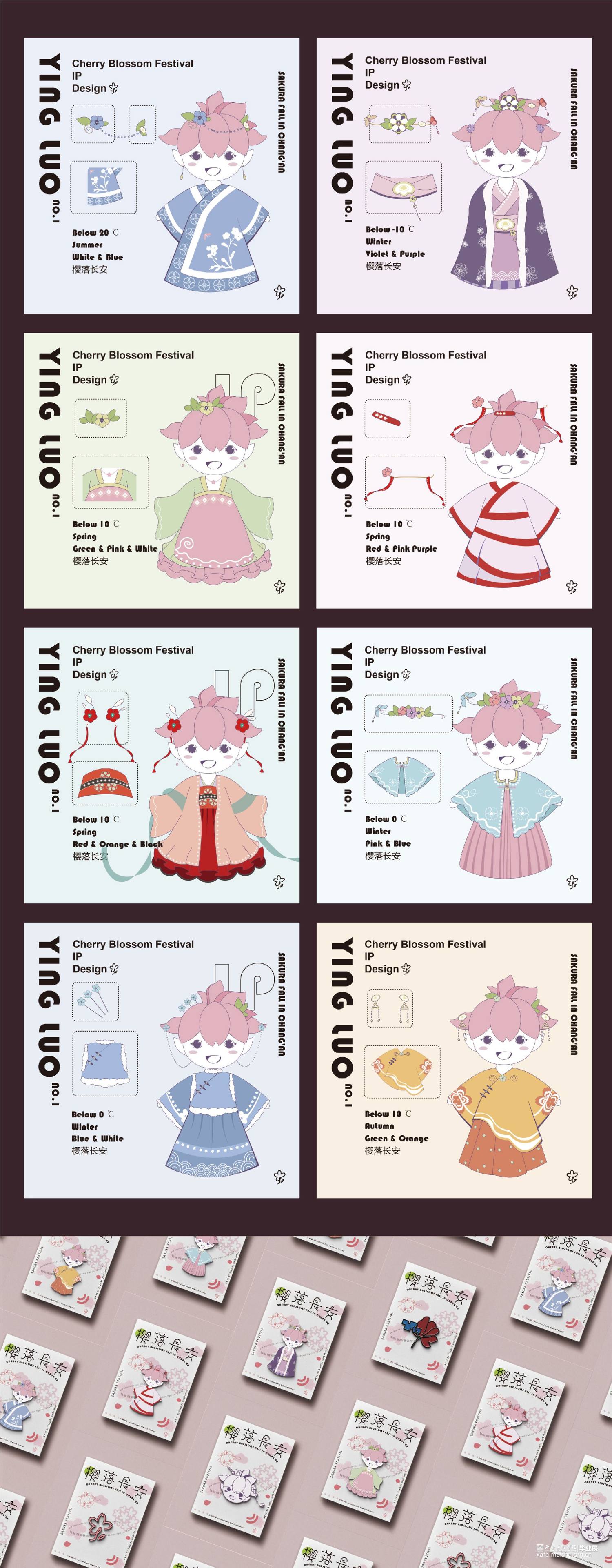 本次毕设凸显樱花节樱花主题,融入传统元素。标志设计以樱花为主题,留下四片花瓣,减少一片,切合选题“樱落”,打破樱花固有形象,使图形更加有趣味性。字体设计为了符合樱花柔美的形象,采取圆润的设计。IP设计以汉服和小女孩为灵感,切合青龙寺形象。文创产品主要根据青龙寺景区游客需求设计。