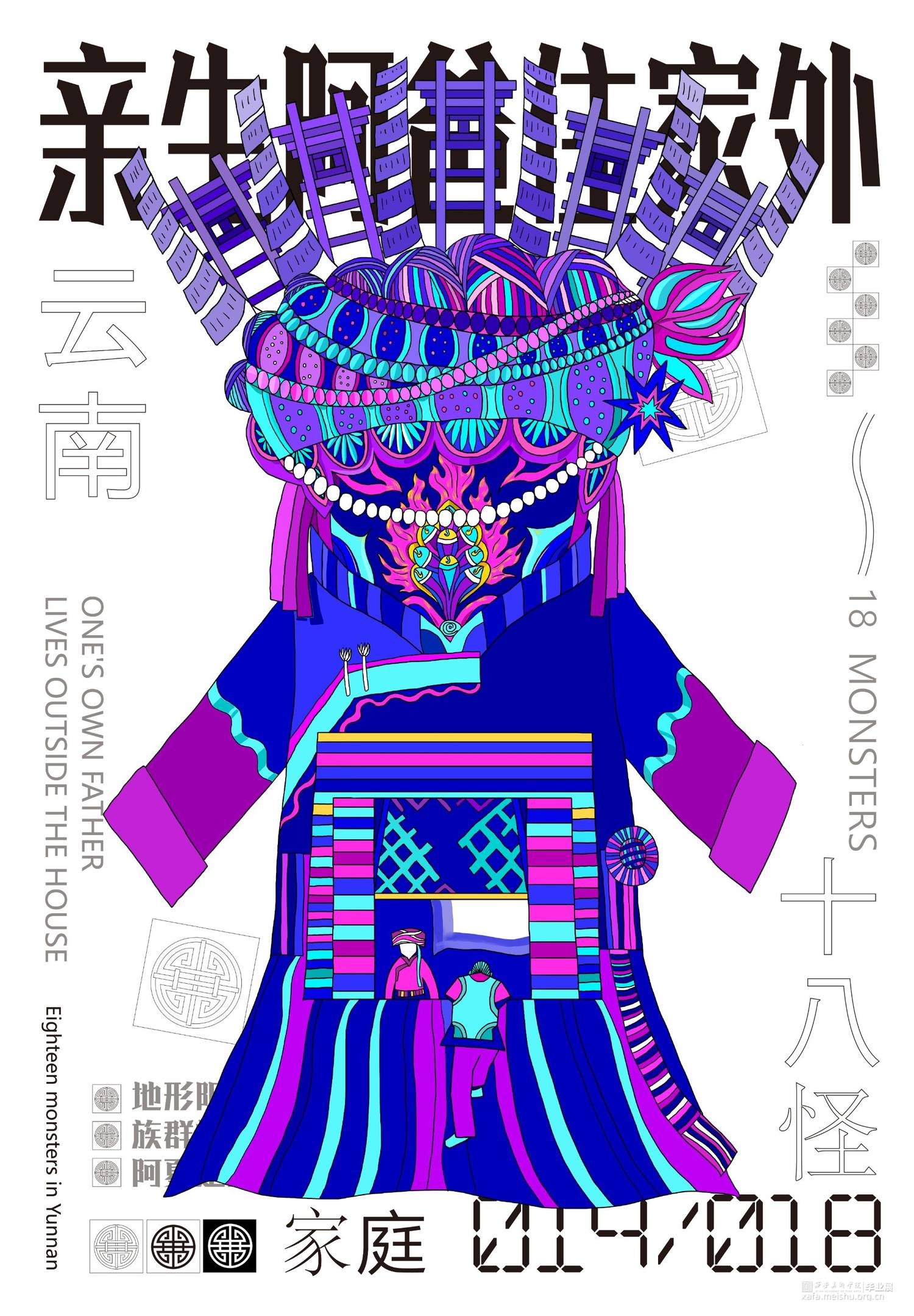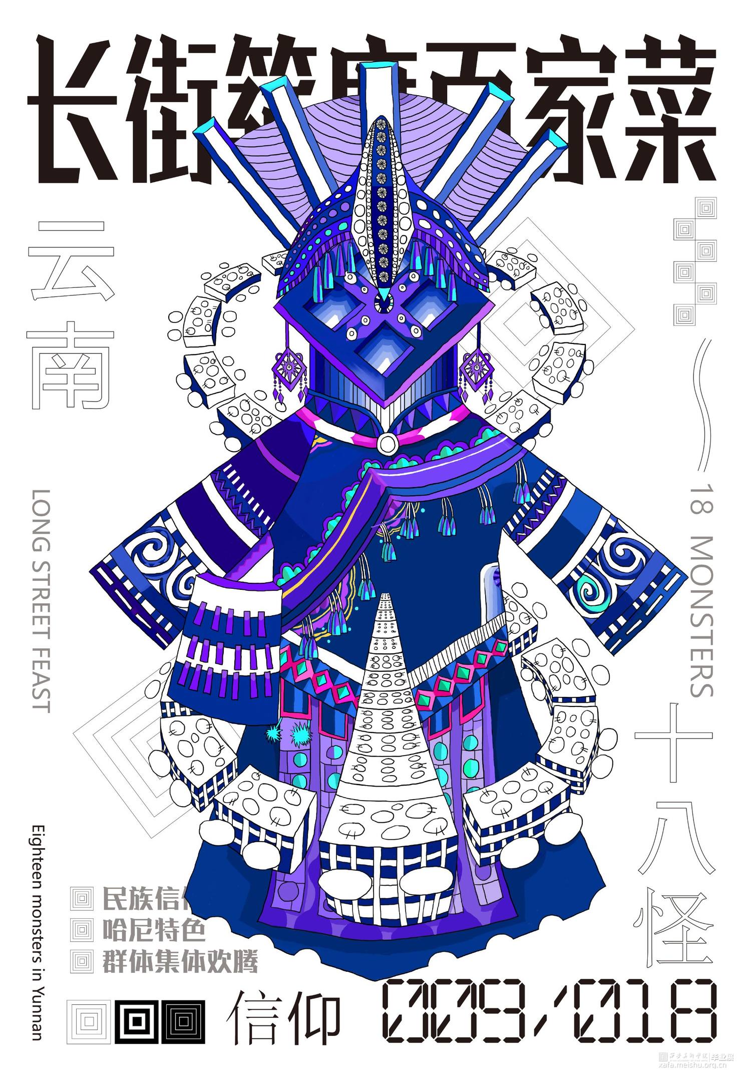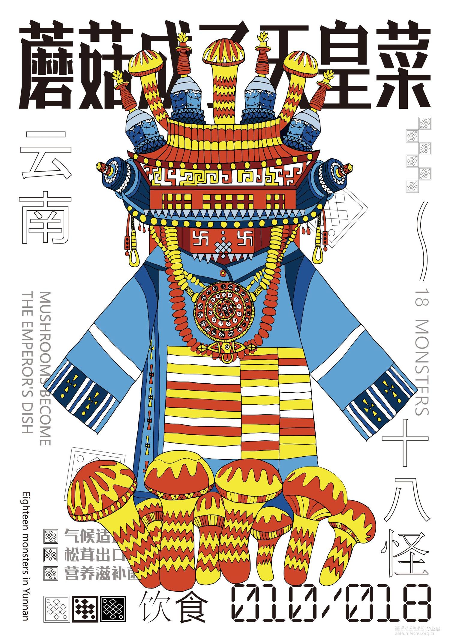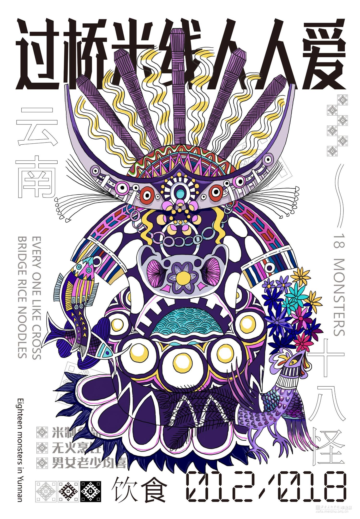 把传统民俗和现代视觉设计相结合,抽象的表现传统民俗内容内涵,给予观者新的视觉角度去重新认识云南传统文化。设计作品的名称为“怪里咕咚”,是根据云南方言“怪里古董”谐音演变的,怪里古董是奇怪、独特的东西 .中国传统文化历史悠久,其中数云南传统民族文化独树一帜因其民族的冗杂与境外文明的交融,赋予了云南神秘的面纱。代表云南的元素有很多:建水紫陶、孔雀舞、银饰等 “云南十八怪”则是云南地区少数民族习俗与当地传统文化的集大成者。也正是因为“云南十八怪”这一相对具象的元素贯穿整个作品。