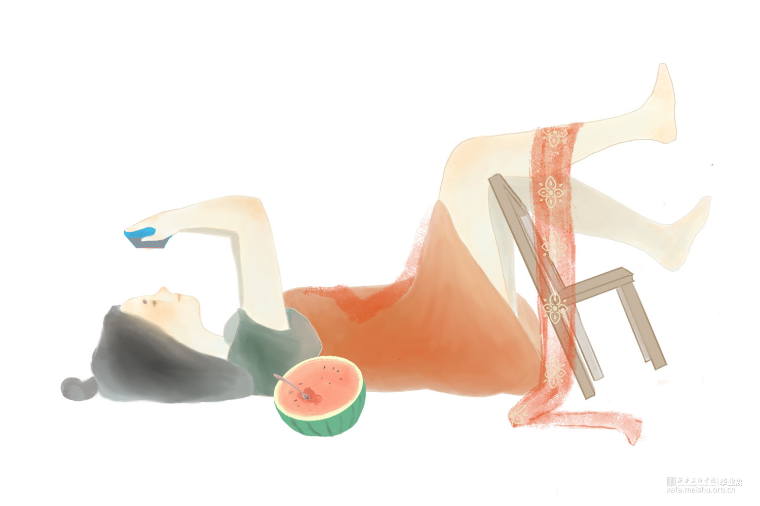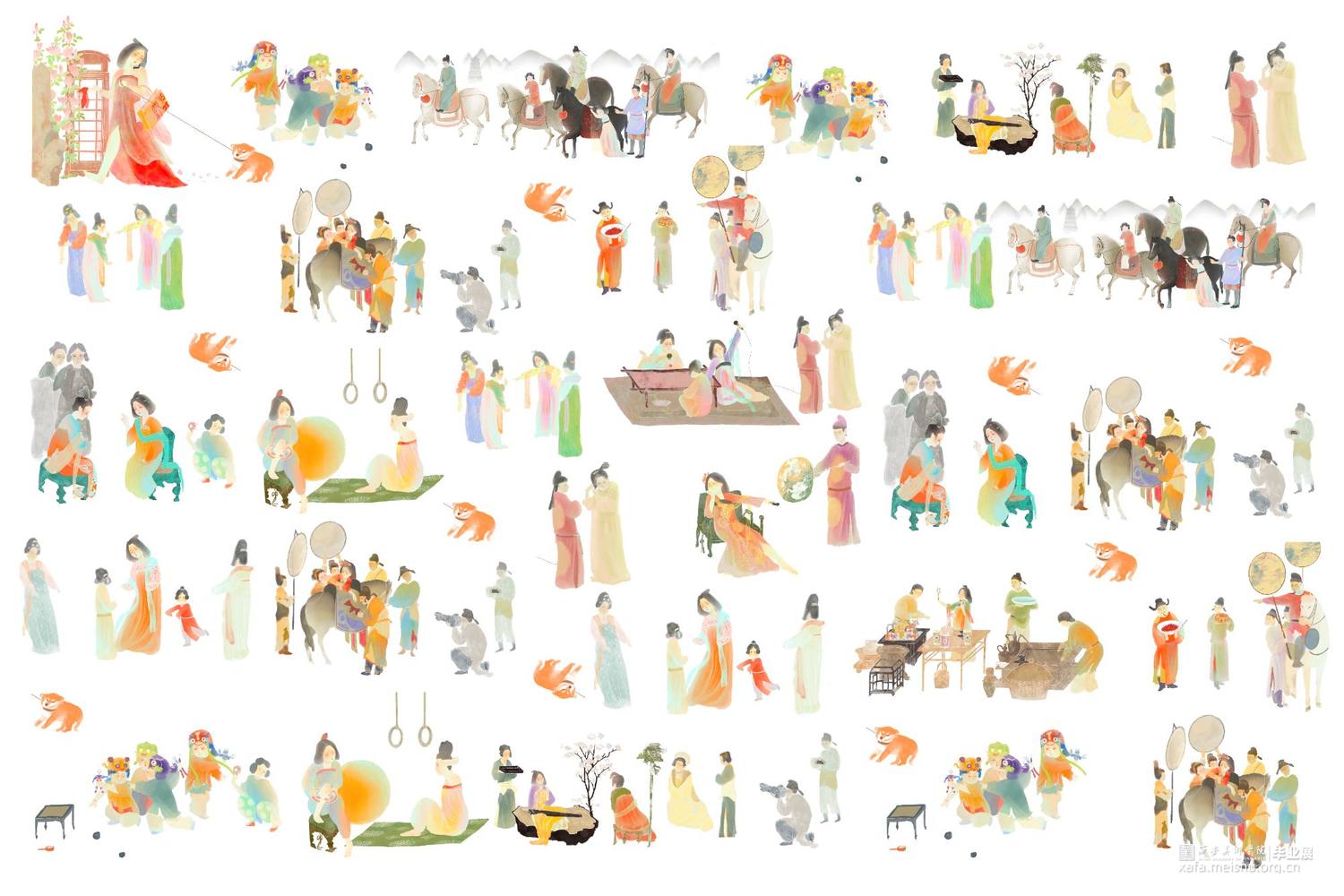 唐画的构图总是让人摸不着头脑,但这种不明所以的风格也给了人深刻的印象。我们一定程度上保留了唐画的构图、人物的服饰造型,在此基础上改动了画风、主题、人物肢体语言,再加上现代元素、西安元素……一通操作后,这些沉淀在历史里的古人似乎又活了过来,古人过起了现代人的生活。
