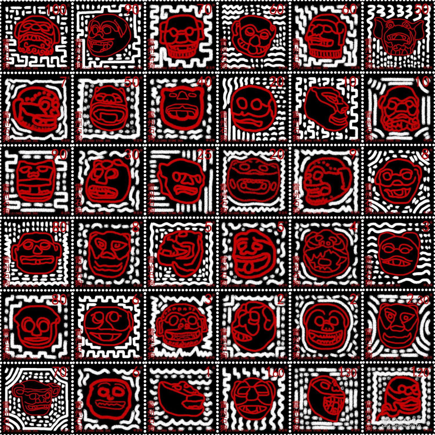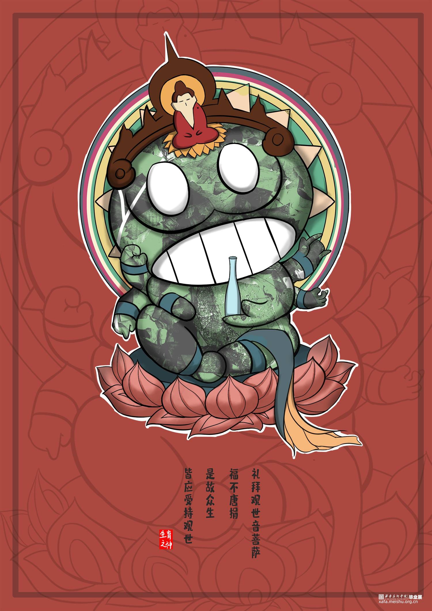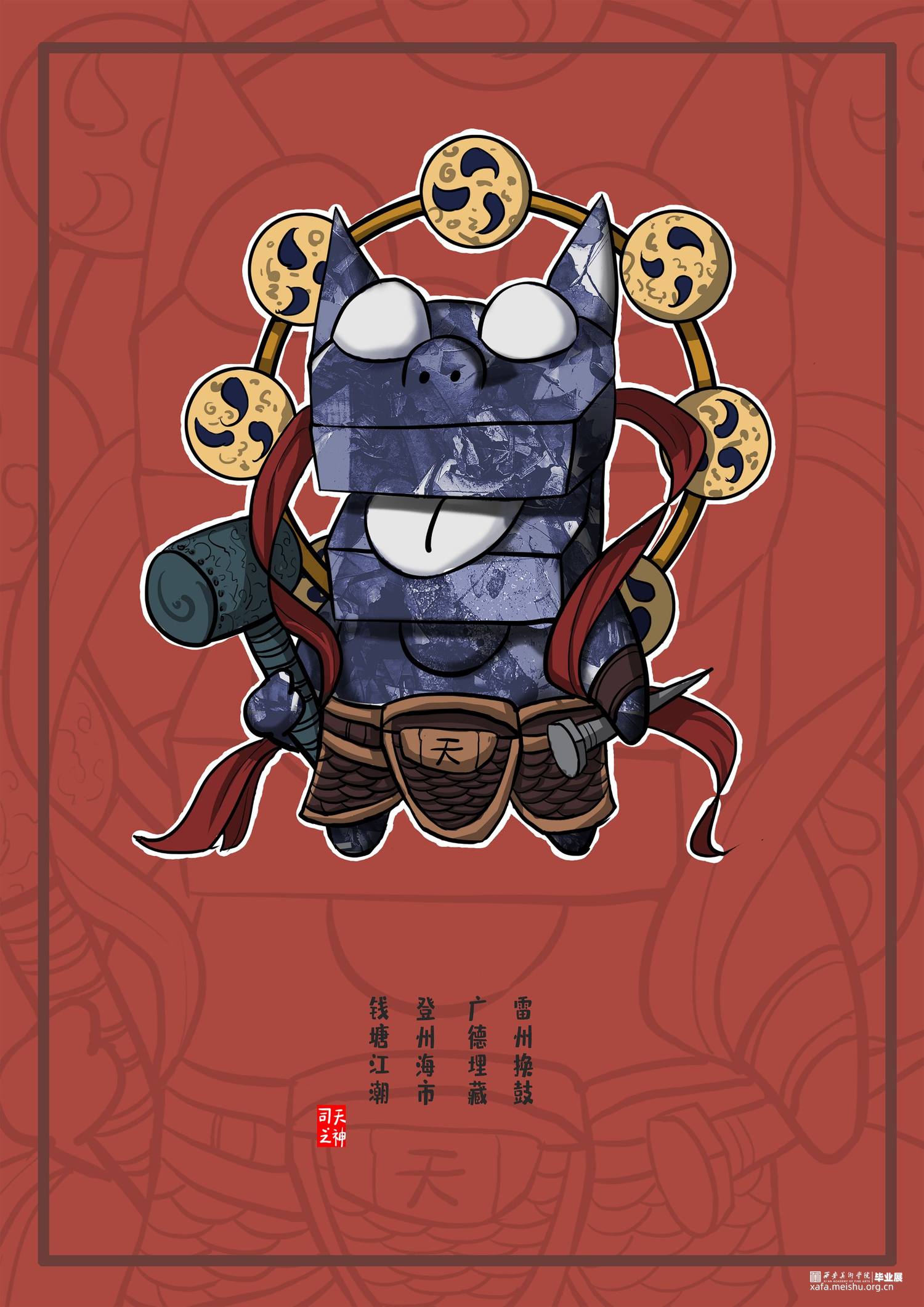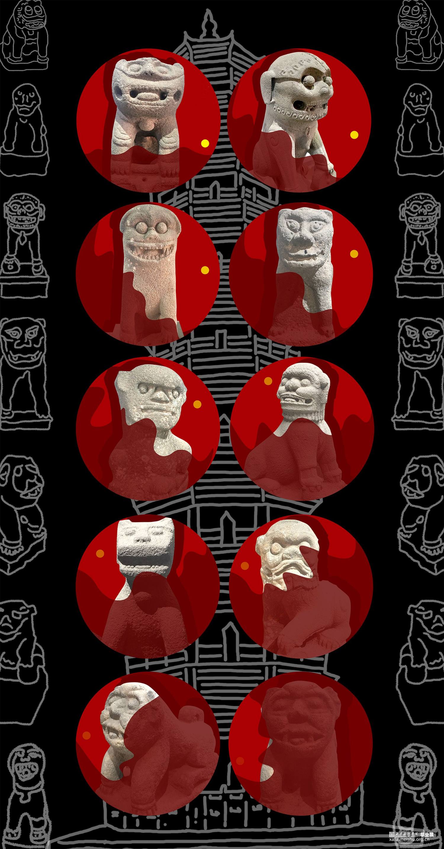 设计以主色调红白黑色为主,以对联的形式表现石狗文创品牌的宣传海报,将手绘设计的石狗形象放于圆形中,随着时间的流动变化,色块覆盖石狗的面积越来越大,表现石狗的破坏程度越来越严重,由于引发人们对石狗的重视和保护,底纹以雷州市三元塔公园进行设计,整体颜色以黑白红为主,对比非常强烈,整体氛围也厚重,有文化气息。三张整体的主视觉海报,以石狗的形态进行手绘描绘,有石狗的肌理质感,又显的特别的灵活生动,细节丰富,手绘的设计表现手法去表现,更加的切实,冲击力强。又进行了描绘设计,设计了三十六个石狗图案做为邮票,以三十六种石狗形象设计而成,加以点线的形式结合设计,颜色以黑白红为主,显的中间的红色线性的石狗非常显眼,每个图形的点线有不同的设计,邮票有很多不同的面值,整理成一整张,用来宣传雷州石狗的形象。关于IP形象的设计,在六种神石的基础上进行造型的设计,在原有的基础上调整,设计的更加美观,生动,同时保留石狗的形态特征,运用肌理的视觉效果进行设计创作,效果非常的强烈且独特,有与众不同的视觉感,并赋于了颜色,突破了原来石狗本身的石头单色色调,以六种颜色进行设计,更加的活跃有时代感,拉近与人们的距离,为石狗增加温度。插画的设计以IP形象拓展设计,将各个神的形状赋于职位和装饰,各个神的代表装备,形象都进行了进一步的升华,一眼能看出各种神的职位特征。打造雷州神石文创品牌,宣传推广好雷州石狗文化。